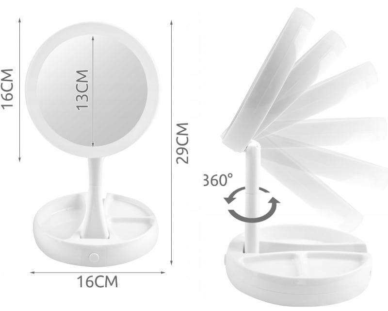 • PŘENOSNÉ – LED osvětlené zrcátko lze zcela sklopit a zabírá málo místa. Je napájen bateriemi – můžete si je dát kamkoli chcete, aniž byste se museli starat o zdroj energie nebo použít kabel obsažený v sadě – volba je na vás. Bude to fungovat doma, v kosmetickém salonu i na cestách. Jeho designový vzhled a plná funkčnost ho činí dokonalým jako nápad na dárek.