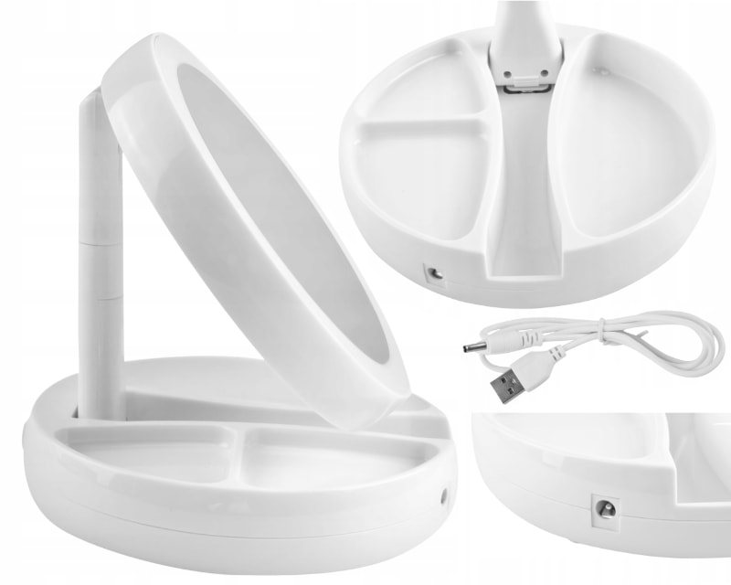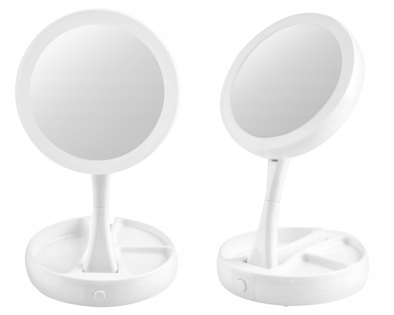 • OSVĚTLENÍ – zrcadlo má schopnost zapnout LED podsvícení, které je ideální pro osvětlení celé tváře. Aktivuje se stisknutím tlačítka na podstavci. Je oboustranné! Na jedné straně má zrcadlo přirozenou velikost, zatímco na druhé straně bylo použito 10ti násobné zvětšení, podle potřeby jej můžete otočit. Osvětlené kosmetické zrcátko bude dobře fungovat nejen při líčení, ale také při dalších kosmetických ošetřeních – s jeho pomocí si můžete nasadit masku, upravit obočí nebo nasadit a odstranit čočky, bez ohledu na světelné podmínky v místnosti, zrcadlo poskytne silné a jasné světlo.