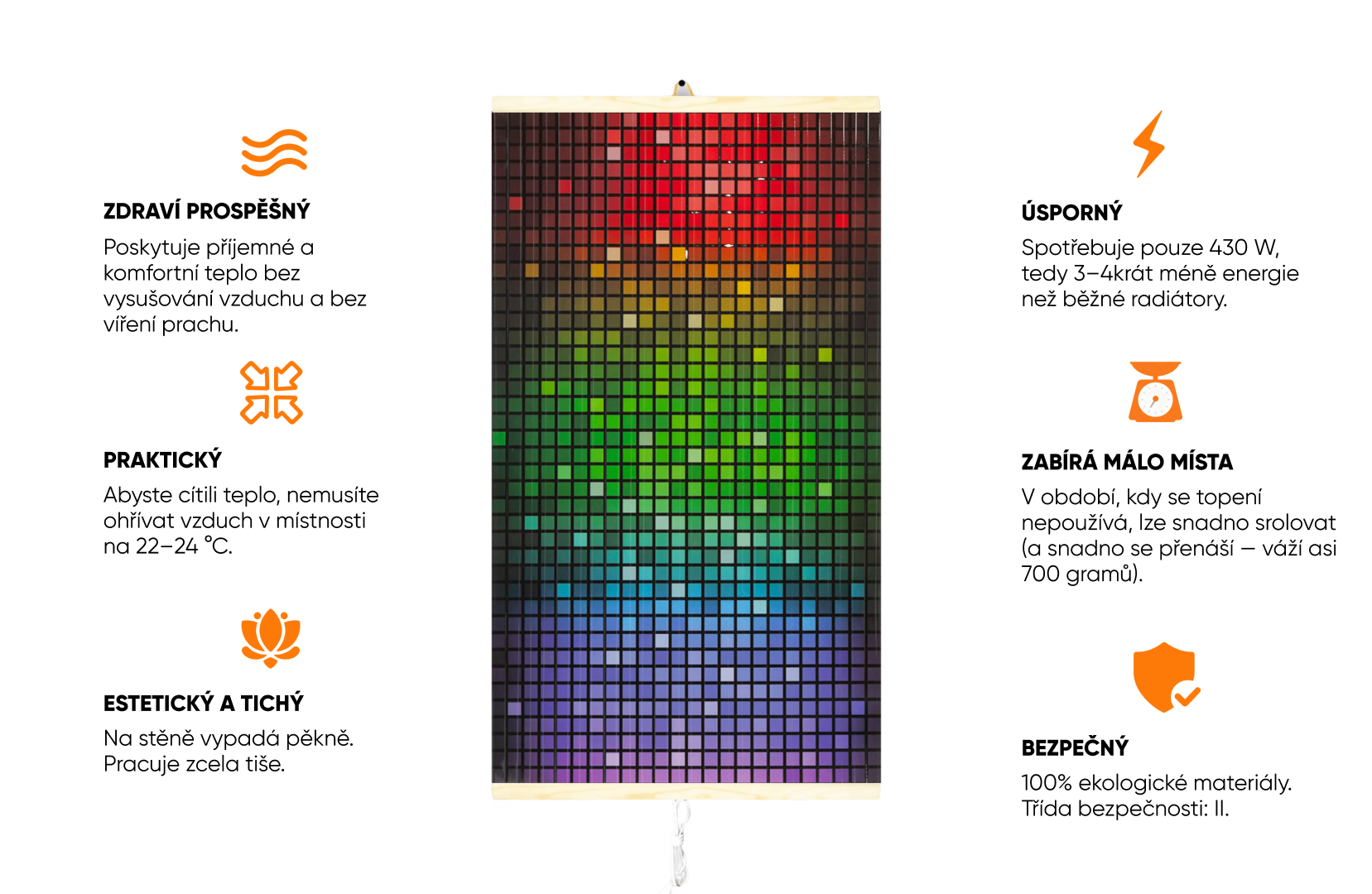 Nejen, že poskytuje příjemné teplo v každé místnosti vysoce účinným a kompaktním způsobem, ale také jí dodává nový lesk a barvu s potištěným bezrámovým povrchem, který upoutá pozornost v každé místnosti. Topný panel je velmi plochý – stejně jako obrázek – lze jej tedy zavěsit přímo na zeď, odkud bude sálat příjemné teplo.