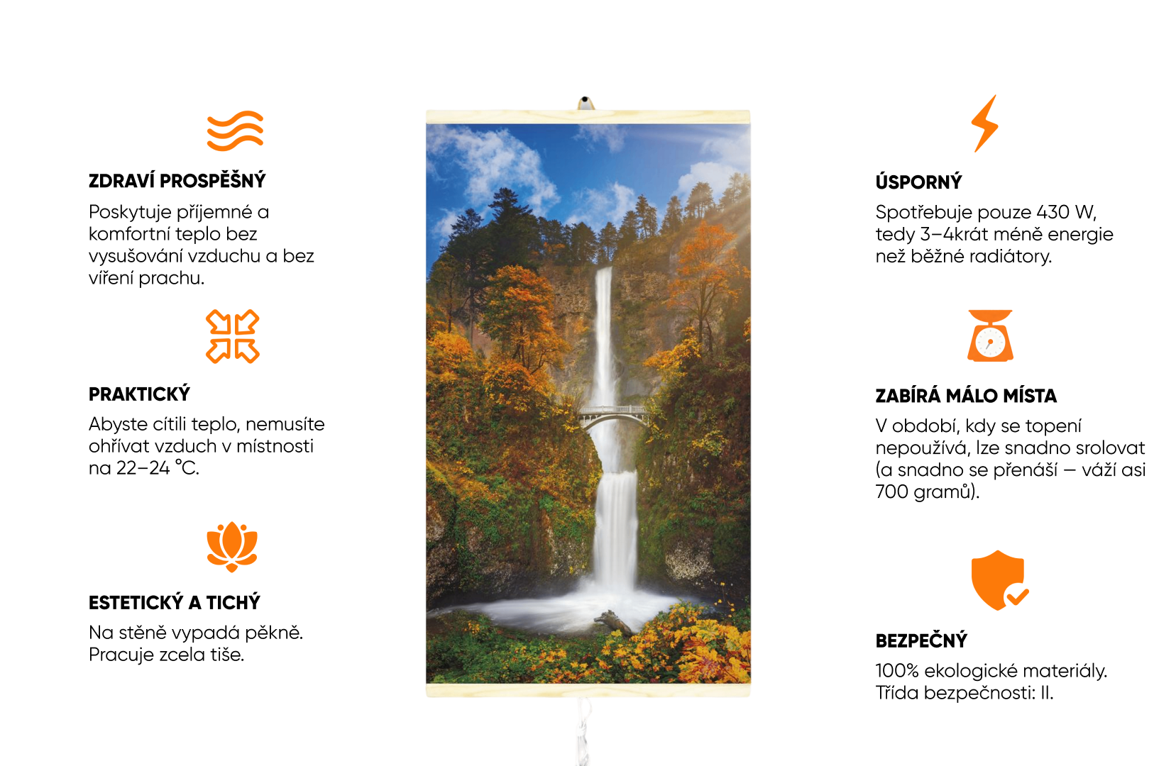 Nejen, že poskytuje příjemné teplo v každé místnosti vysoce účinným a kompaktním způsobem, ale také jí dodává nový lesk a barvu s potištěným bezrámovým povrchem, který upoutá pozornost v každé místnosti. Topný panel je velmi plochý – stejně jako obrázek – lze jej tedy zavěsit přímo na zeď, odkud bude sálat příjemné teplo.